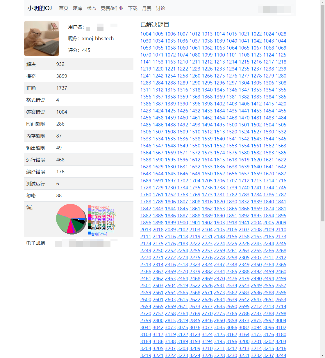 小明的OJ增强脚本 (XMOJ-Script) 在多个方面提供了有益的功能和改进。 首先,通过比赛ACM排名和下载功能,用户可以更方便地浏览比赛的排名情况,并且能够将相关信息下载以备离线查阅,这对于参赛者和观众来说都是一项实用的功能。 界面美化方面,采用新版的Bootstrap样式库、彩色文字和暗色模式等,能够显著提升用户界面的视觉吸引力和舒适度。